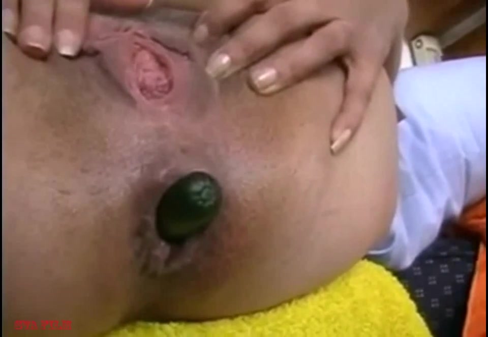 Молодую девку трахают огурцом в задницу
